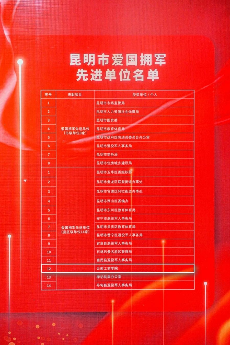 3月14日,以“向榜样致敬 与先进同行”为主题的昆明警备区“‘五美’人物先进事迹报告暨颁奖典礼”顺利举行。昆明市委常委、昆明警备区司令员任兴格,副市长赵波,昆明警备区政委吴正良出席活动。在此次颁奖仪式中,云南工商学院荣获“爱国拥军先进单位”的荣誉称号,是获得此奖项的14个单位中唯一的高校。