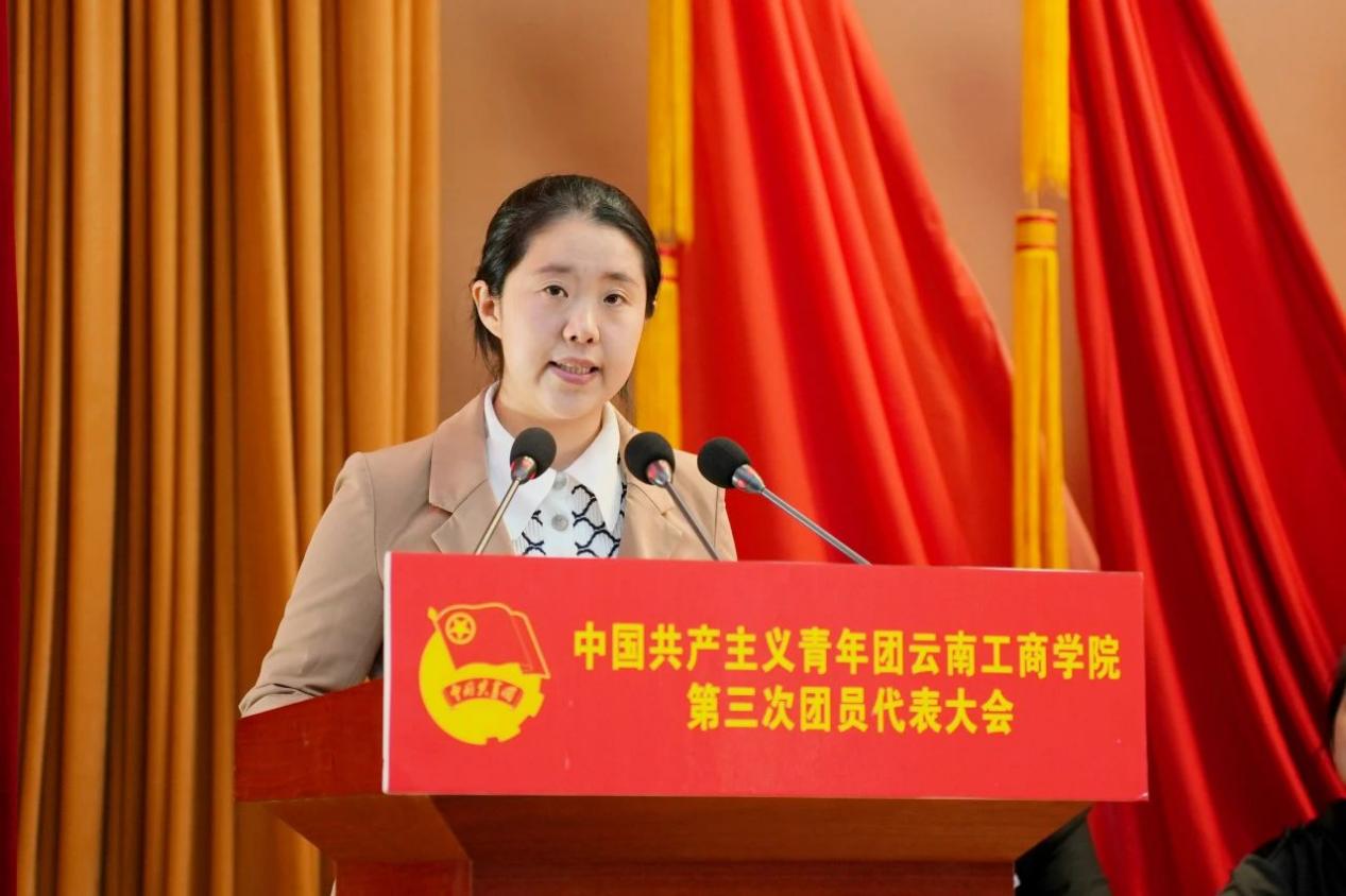唐艺涵代表共青团云南工商学院第二届委员会向大会作工作报告。大会以“高举团旗跟党走,挺膺担当践初心”为主题。五年来,在学校党委的正确领导下,各级团组织聚焦主责主业、基层基础、学生成长成才、社会责任等方面全面发力,成效明显,今后五年,学校共青团工作将坚持“三力一度两保障”工作格局,深化思想引领,坚持为党育人;立足岗位建功,精心服务大局,不断凝聚投身建设的先锋力量;聚焦基层基础,全面从严治团,矢志打造勇立时代潮头的先进组织,切实履行好引领凝聚青年、组织动员青年、联系服务青年的职责使命。