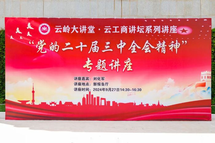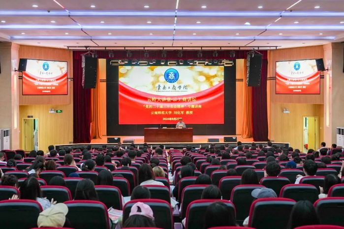 9月27日,云南工商学院开展云岭大讲堂∙云工商讲坛“党的二十届三中全会精神”专题讲座,学校党政领导班子、全体管理干部、全体党务工作者,师生代表300余人参加活动,活动由学校马克思主义学院学术院长阮金纯主持。