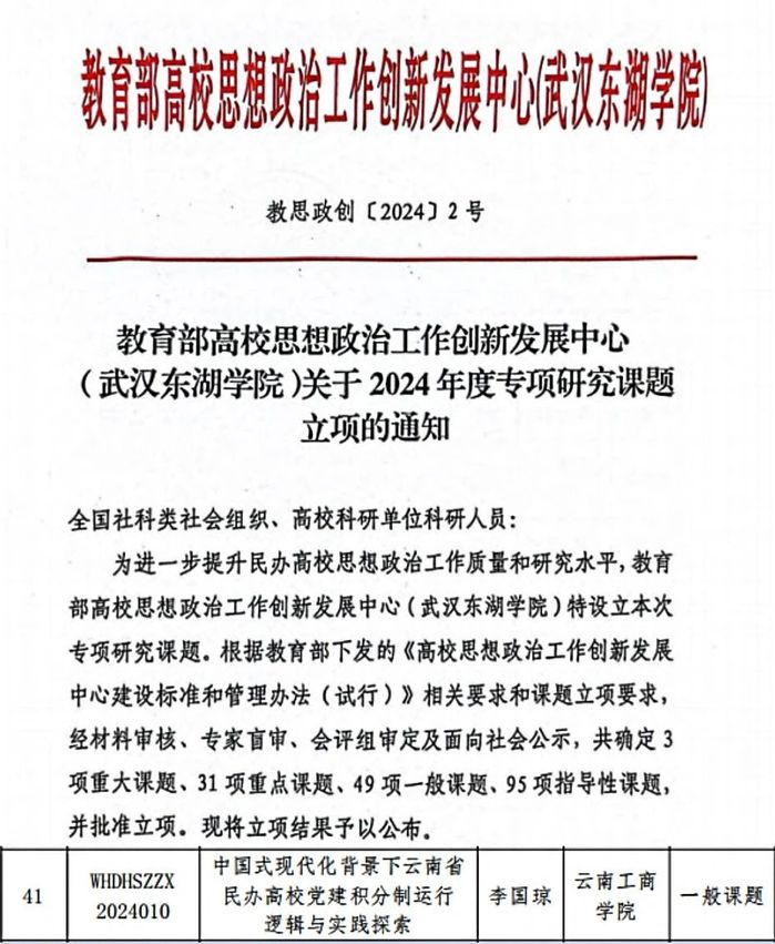 为进一步提升民办高校思想政治工作质量和研究水平,近期,教育部高校思想政治工作创新发展中心(武汉东湖学院)组织开展了2024年度中心专项研究课题申报工作。经评审,云南工商学院党委书记李国琼牵头申报的《中国式现代化背景下云南省民办高校党建积分制运行逻辑与实践探索》课题成功获批立项。