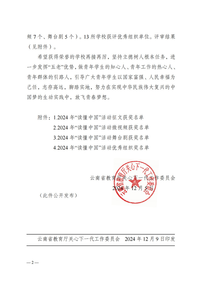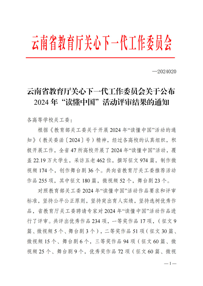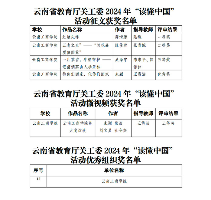 为深入学习宣传贯彻党的二十大和二十届三中全会精神,省教育厅关工委在全省高校中全面开展以“教育强国,奋斗有我”为主题的“读懂中国”活动。根据《云南省教育厅关心下一代工作委员会关于公布2024年“读懂中国”活动评审结果的通知》公布的获奖名单。云南工商学院荣获一等奖1项、二等奖1项、三等奖2项、优秀奖1项,学校获评优秀组织奖。