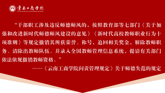 围绕师德师风建设制度体系,详细解读了《云南工商学院问责管理规定》《新时代高校教师职业行为十项准则》等文件核心条款。学校对师德失范行为实行“零容忍”,建立了“发现一起、查处一起、通报一起”的快速处置机制,具体处理包括: