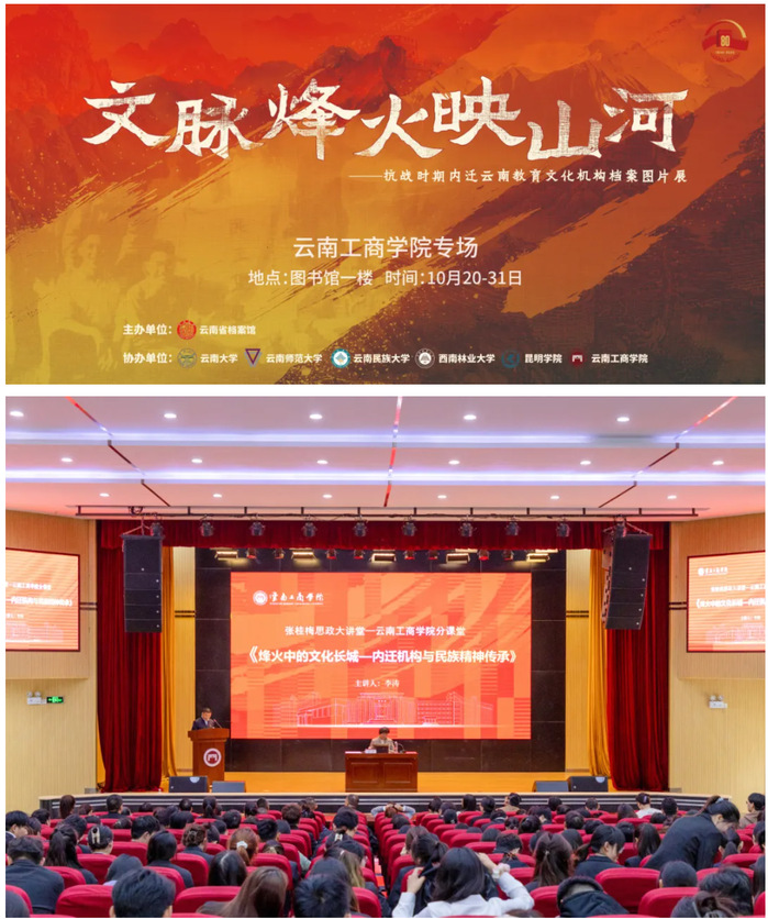 本次讲座是“文脉烽火映山河——抗战时期内迁云南教育文化机构档案图片展”的系列活动之一。该展览由云南省档案馆联合云南大学、云南师范大学、西南林业大学、云南民族大学、昆明学院、云南工商学院共同主办。展览通过系统梳理并展出近200件抗日战争时期内迁云南的教育、文化机构珍贵档案与图片,生动再现教育文化机构内迁云南的历史片段,持续激发新时代青年学子的爱国情怀和历史使命感。其中,云南工商学院专场展览依托嵩明职教新城高校党建联学联建平台,为园区高校师生打造了学习抗战历史、感悟民族精神的优质文化交流平台,同时也是嵩明县大中小学思政教育一体化的一次生动展现。