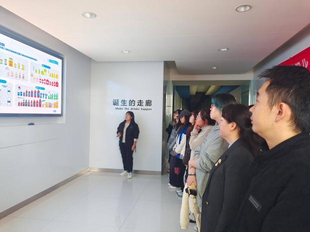 随后,师生党员参观自动化生产车间:透过透明观察窗,高速运转的瓶胚注塑机、每小时3.8万瓶产能的全自动灌装线、AI实时监控的智能分拣包装系统有序作业,了解企业实践成果。师生深入交流,为“五位一体”育人体系中的“实景课堂”“真实项目”提供了具象化参考。