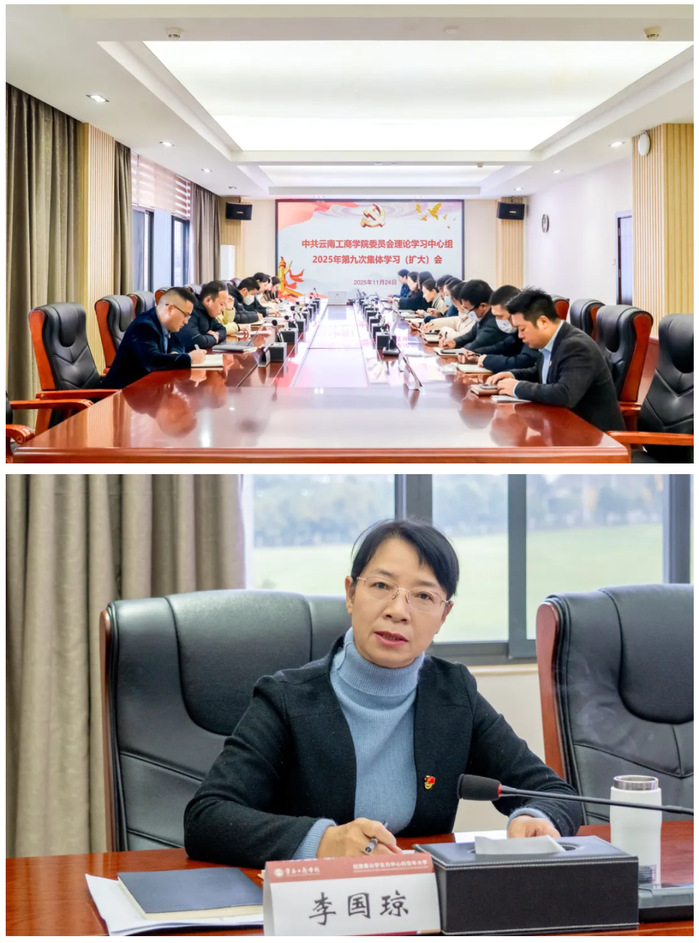 11月24日,云南工商学院党委理论学习中心组召开 2025年第九次集体学习(扩大)会,深入学习习近平总书记关于思想政治工作的重要讲话精神和对全面依法治国工作作出的重要指示精神,系统学习《中国共产党思想政治工作条例》。党委书记李国琼主持会议并讲话。