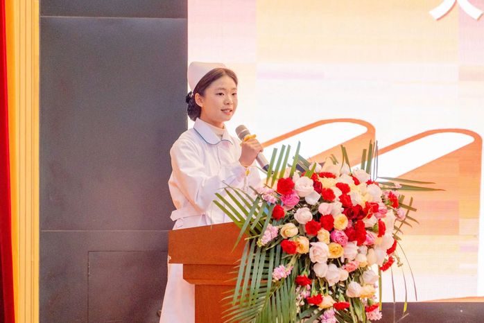 学生代表刘曦郑重承诺:“将以楷模为镜,以仁爱守护生命,以专业践行使命。”随后,王克荣、刘小娟与我校护理教师共同为2025级新生授帽。洁白燕帽轻落肩头,象征责任的承接与信念的传承。全体学生手捧烛光,肃立宣誓,铿锵的南丁格尔誓言回荡全场,铭刻于心。